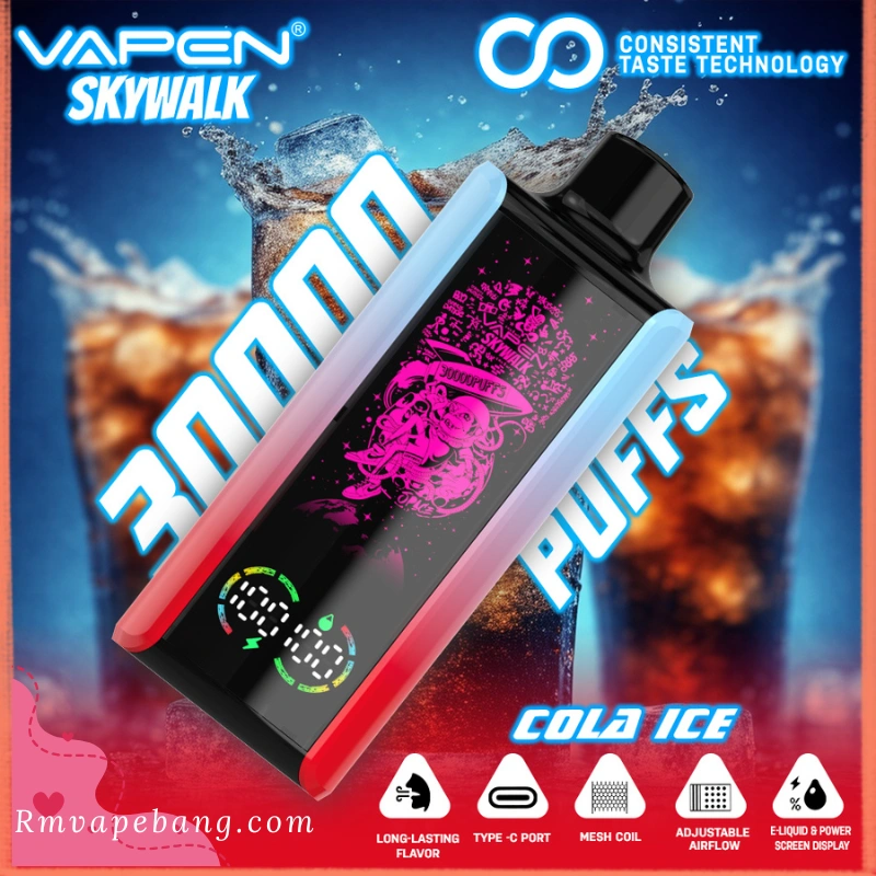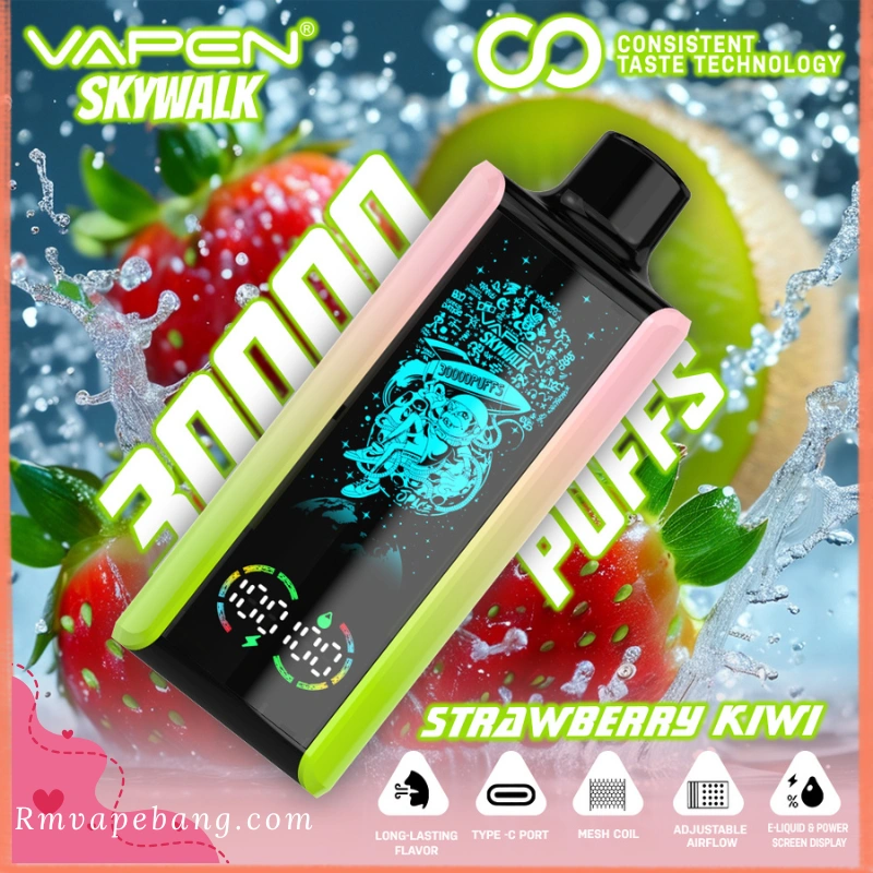VAPEN SKYWALK 30K Puff Disposable Vape Wholesale delivering up to 30000 puffs, this high-capacity disposable vape 30000 puffs features a 650mAh rechargeable battery with Type-C charging for reliable daily use. The adjustable airflow system allows users to customize the draw from smooth to stronger vapor output.